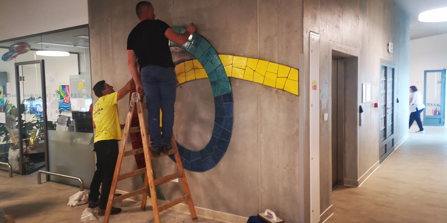 Barevný keramický nástěnný obraz jsem navrhla jako jednoduchou barevnou linii, která v budově domova prochází třemi podlažími nad sebou.